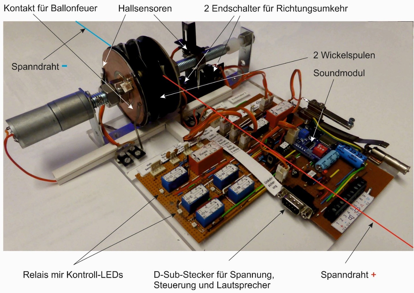 Um den Ballon landen zu lassen muss, wie schon erwähnt, ein Spanndraht verlängert werden. Wir haben als Vorbild das Prinzip eines Flaschenzuges gewählt. Eine Spule ist beweglich so auf einer Trapezspindel angeordnet, dass der Spanndraht in der Länge verändert werden kann. Hierdurch erfolgt eine Landung bzw. ein Start. Für mehrere Sekunden ertönt das aufgespielte Brennergeräusch, das auf einer SIM-Karte aufgespielt ist. Eine 3 mm große weiße LED befindet sich am Korbboden, 2 weitere, etwas größere 5 mm starke weiße und gelbe LEDs, befinden sich im Innern des Ballons.